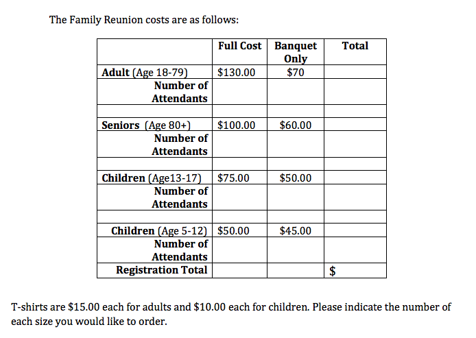 To view and download the family reunion letter and registration packet, click on the PDF link below. You can download, print, complete and mail the completed forms to the address listed on the form. If you prefer you can use our online registration form and pay your registration fees electronically, using PayPal.